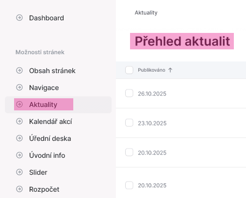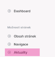 V hlavním levém menu v sekci „Možnosti stránek“ rozkliknete „Aktuality“ a před vámi se objeví rozhraní s názvem „Přehled aktualit“.