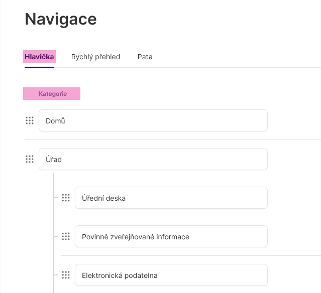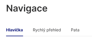 Pro všechny tři editační pole navigace (Hlavička, Rychlý přehled, Pata) existují styčné prvky: