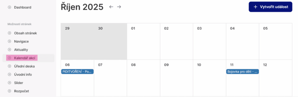 V hlavním levém menu v sekci „Možnosti stránek“ rozkliknete „Kalendář akcí“ a před vámi se objeví rozhraní s klasickým kalendářem, ve kterém se můžete posouvat v řádů dnů u měsíců jako v běžném internetovém kalendáři.