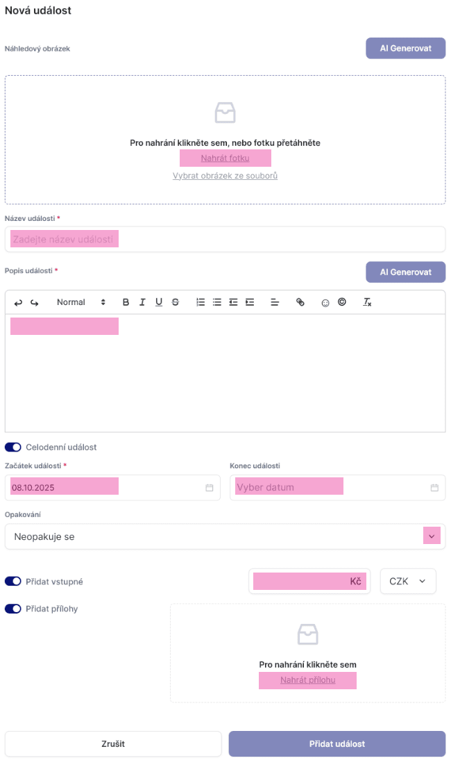 Objeví se před vámi Nová událost jednoduchý kalendář (podobně jako v emailovém kalendáři), kde vložíte fotku / obrázek, název události, popis, dobu trvání od do, opakování události, cenu vstupného a případné přílohy.