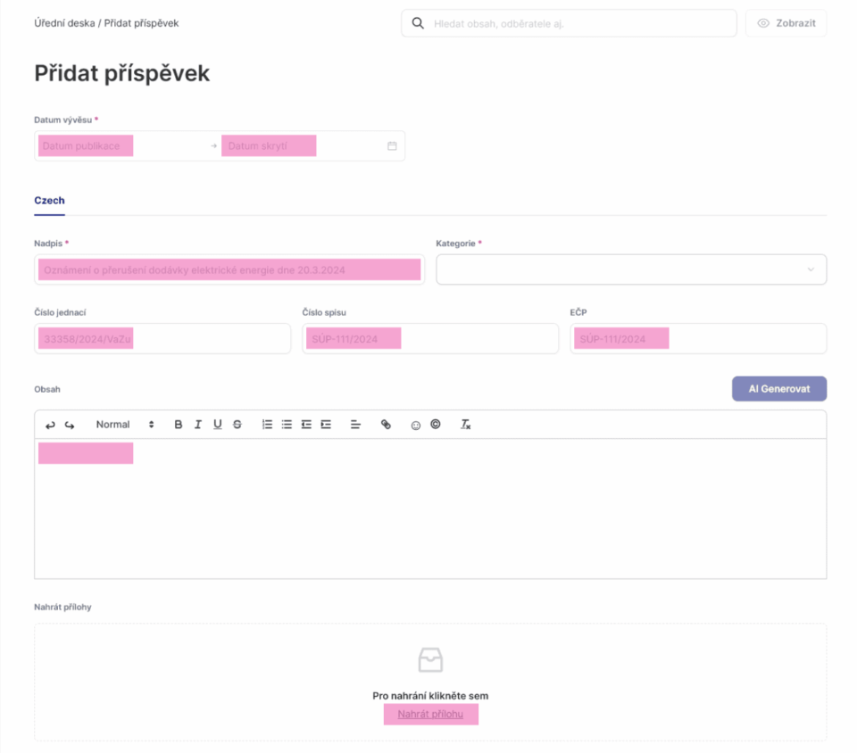 Objeví se před vámi jednoduchý formulář, kde zadáte datum vývěsu / datum skrytí, nadpis, kategorii, jednací číslo, číslo spisu, EPČ a obsah sdělení, který můžete editovat podobně jako například v nástrojích Microsoft Office, včetně přidání příloh.
