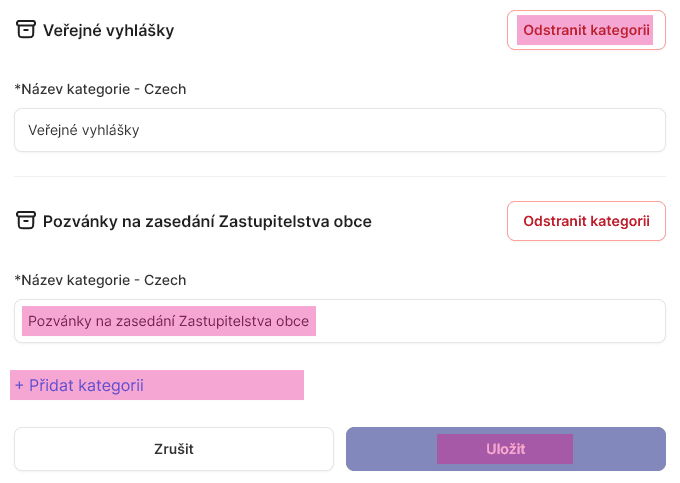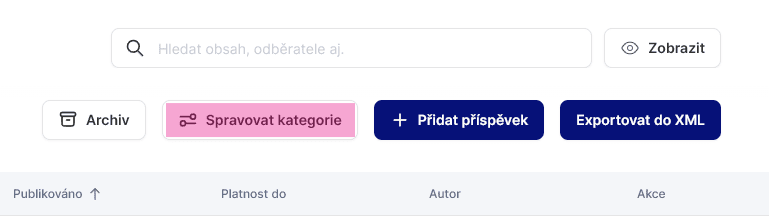 Pro lepší přehled a třídění je možné jednotlivá sdělení také rozdělit do jednotlivých kategorií (které jdou následně přímo na webu vyselektovat) pomocí bílé ikonky „Spravovat kategorie“ v pravém horním rohu.