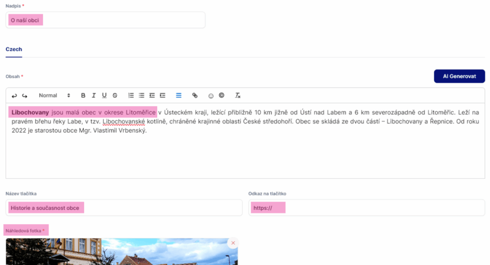 Objeví se před vámi jednoduchý formulář, kde zadáte nadpis a obsah, který můžete editovat podobně jako například v nástrojích Microsoft Office. Do kolonky „Odkaz na tlačítko“ vložíte link, kam vás má ono tlačítko přesměrovat. Nejčastěji se jedná o podstránku s kontakty, ale není to podmínkou. K textu rovněž vložíte nahráním z počítače „náhledovou fotografii“.