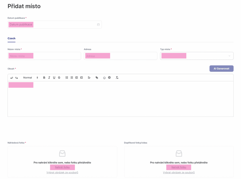Po kliknutí se objeví jednoduchý formulář, kam zadáte datum publikace, název místa, adresu a ze zvolené kategorie vyberete typ tipu. Vyplníte obsah, který můžete editovat podobně jako například v nástrojích Microsoft Office. Přidáte náhledovou fotografii a případně další doplňkové fotografie či video.