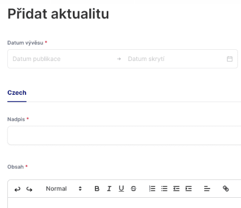 Po rozkliknutí se objeví editační pole aktuality. Zadejte datum publikace a datum skrytí (nápomocný vám může být kalendář), nadpis a obsah aktuality, který můžete editovat podobně jako například v nástrojích Microsoft Office, včetně přidávání odkazů, fotek a videí.