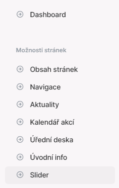 V hlavním levém menu v sekci „Možnosti stránek“ rozkliknete „Slider“