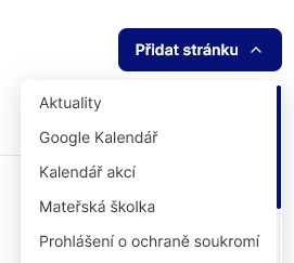 Novou kategorii přidáte pomocí ikonky „Přidat stránku“, kde se vám rozbalí menu s připravenými obsahovými stránkami a pouze kliknete na kýženou, která se objeví na konci sloupce.